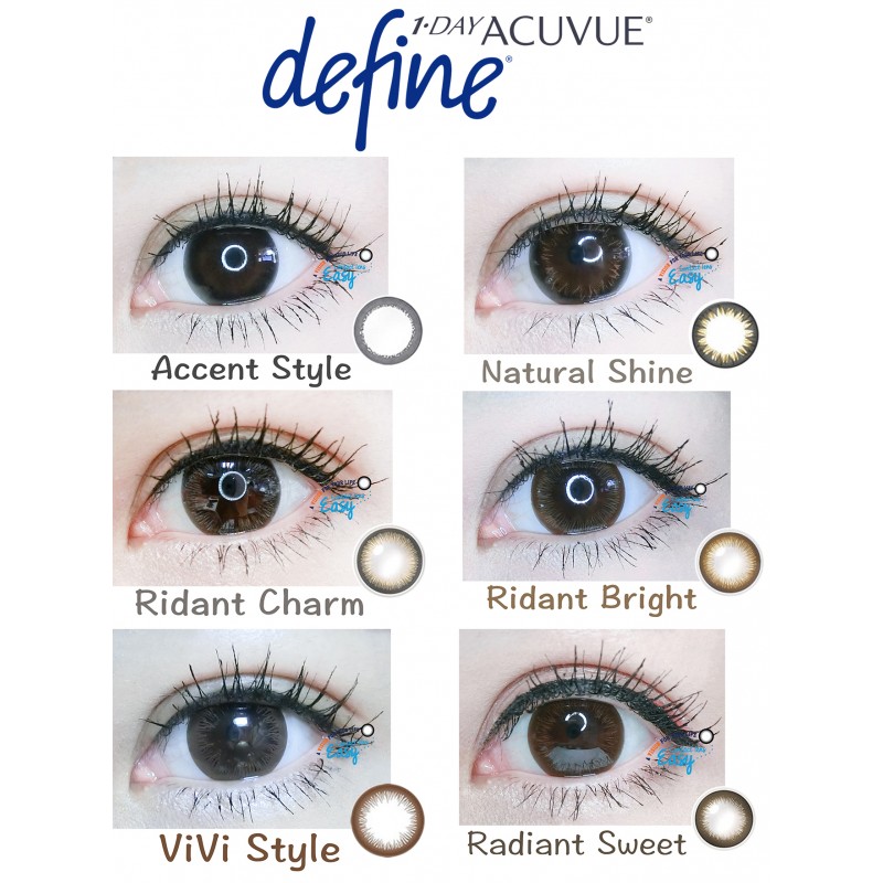 These contacts enhance your natural eye color for a more convincing look. 1-Day Acuvue Define is available in powers ranging from -900 to 100. The new 1-Day Acuvue Define contact lenses work to enhance your eyes natural radiance.